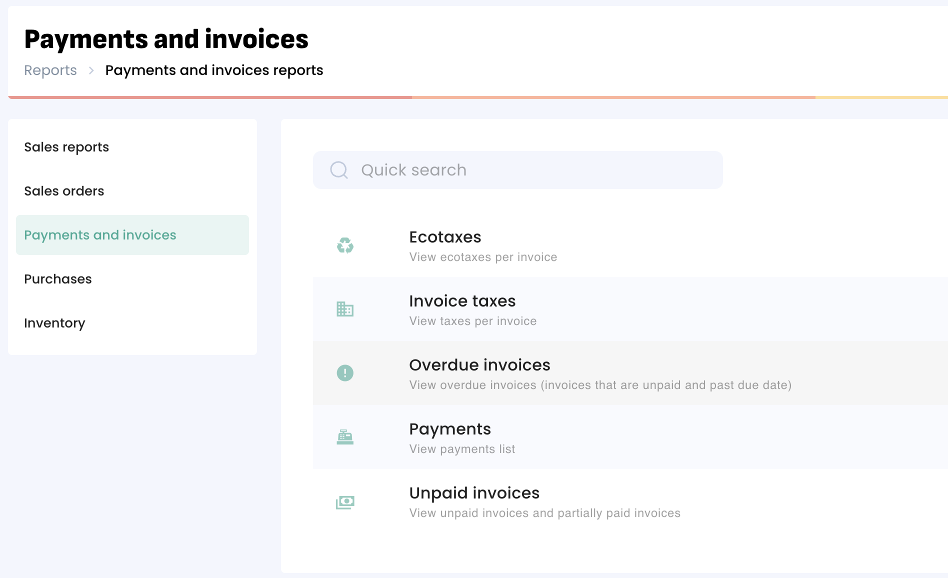 Payments and Invoices reports will give you detailed information on the payments from your customers and the invoices status: