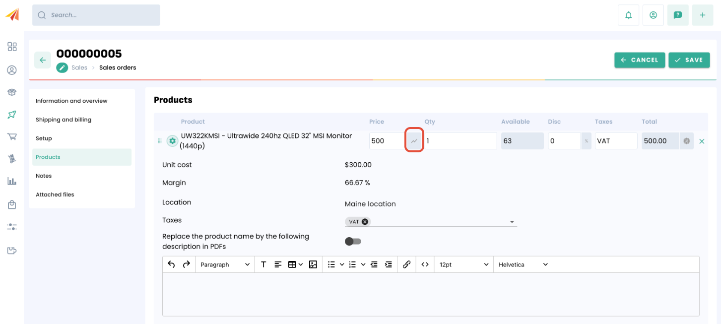 The sales margin can be seen for every product on every sales related documents (estimates, sales orders, invoices). The line item will appear with the logo circled above.