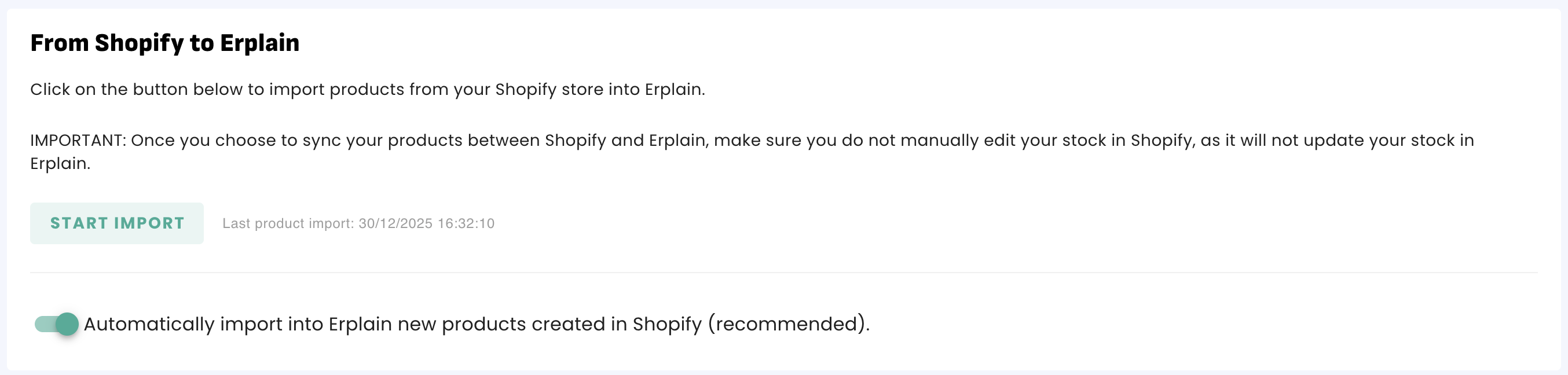 >>> Enable or Disable the automatic sync of Shopify products to Erplain.