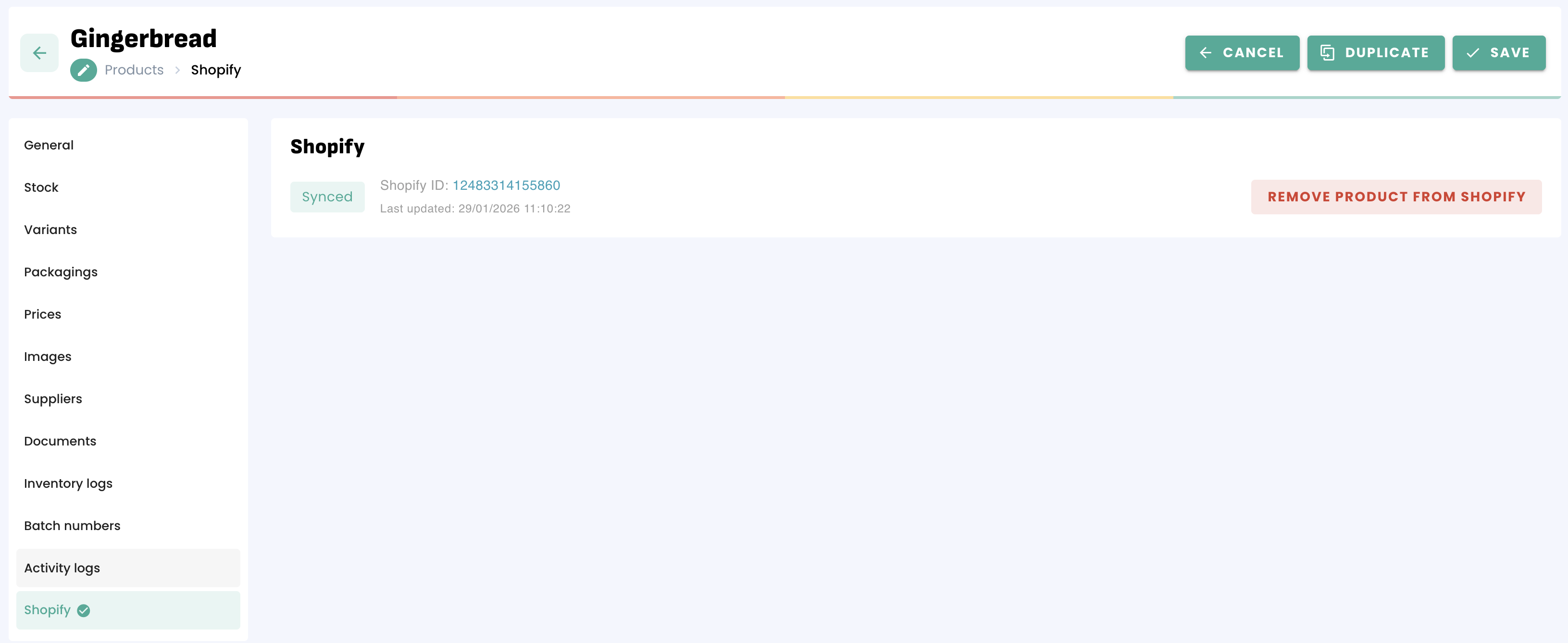 Click 'Remove product from Shopify' to delete this product in Shopify: