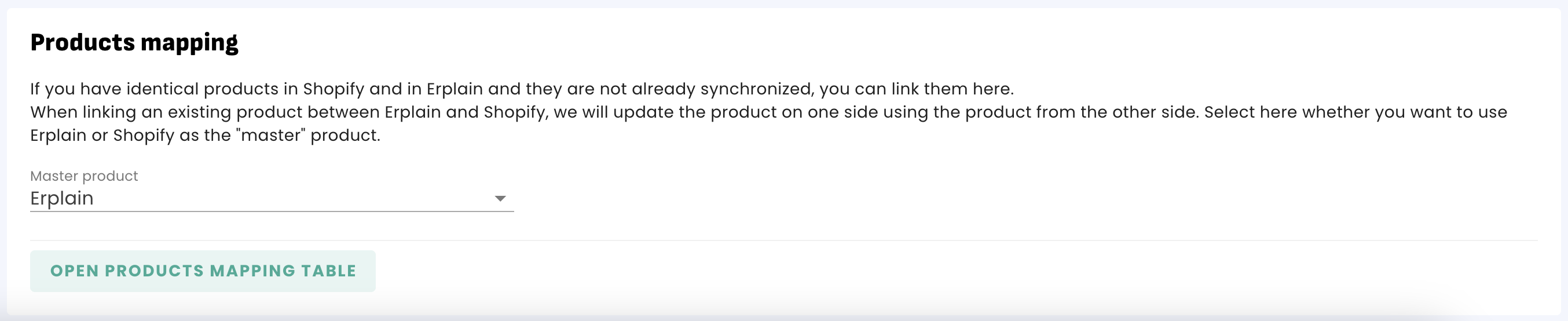 - Choose which system (Erplain or Shopify) will be the 'Master'. This master setting will only apply at the time of the mapping if there is different information in both systems. For example, if Shopify is the master and a product name in Shopify is 'Product ABC V1' and 'Product ABC Version1' in Erplain, the name in Erplain will become 'Product ABC V1'.