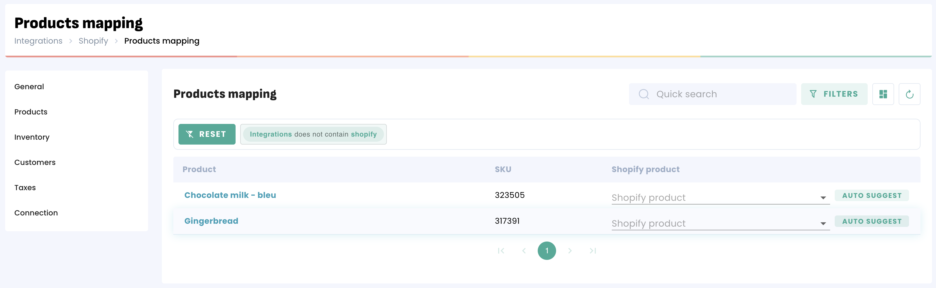 Open Integrations > Shopify > Products, then scroll down to Products Mapping: