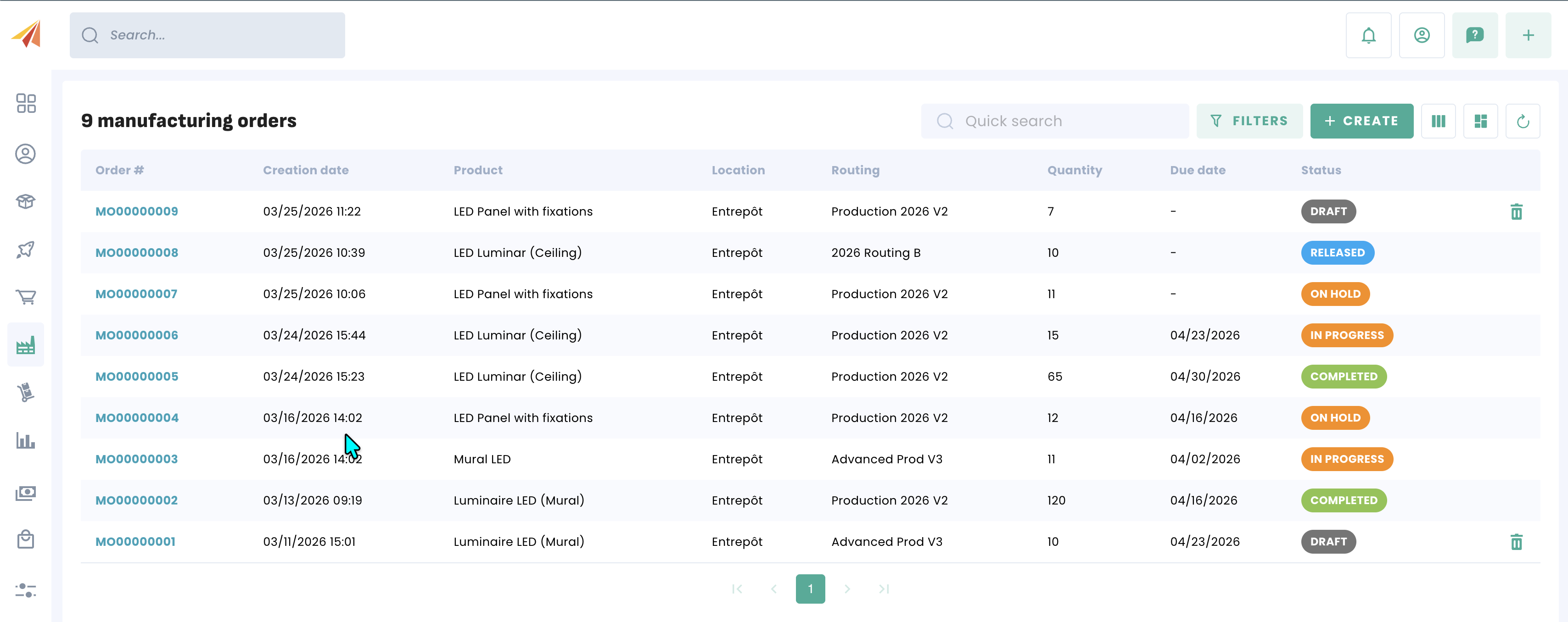 Once these elements are in place, you can create a production order from the Orders submenu in the Manufacturing menu.