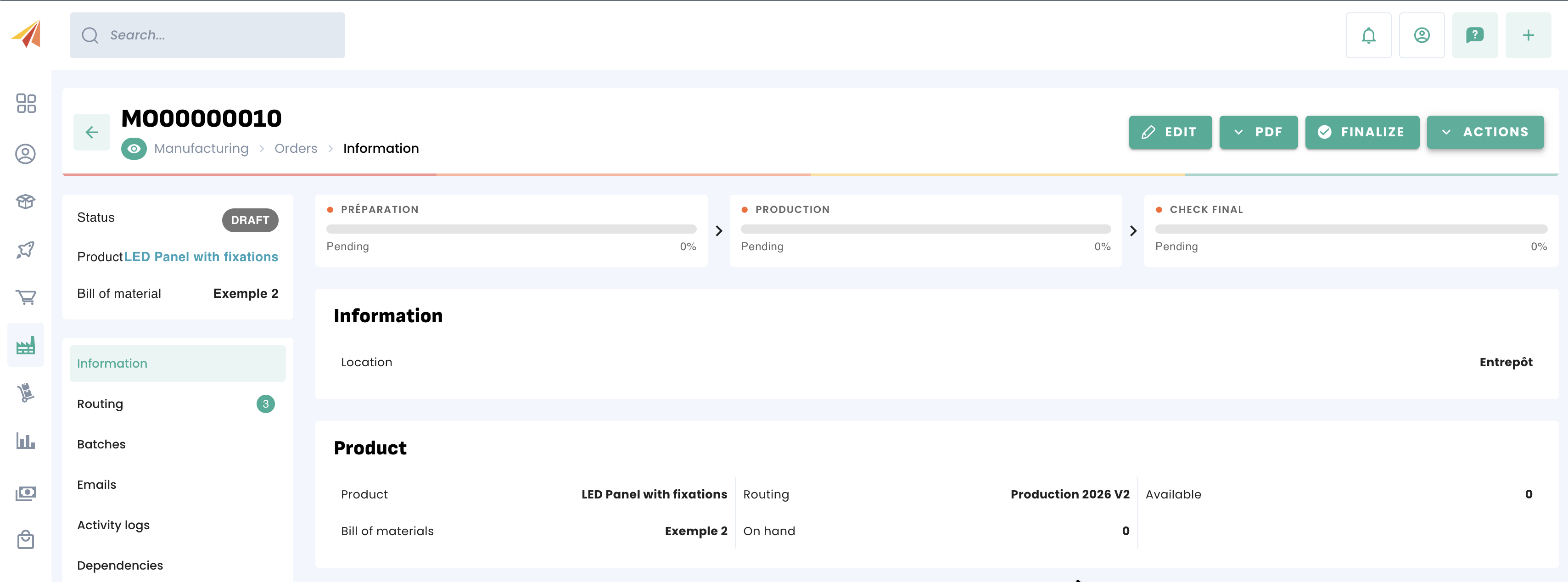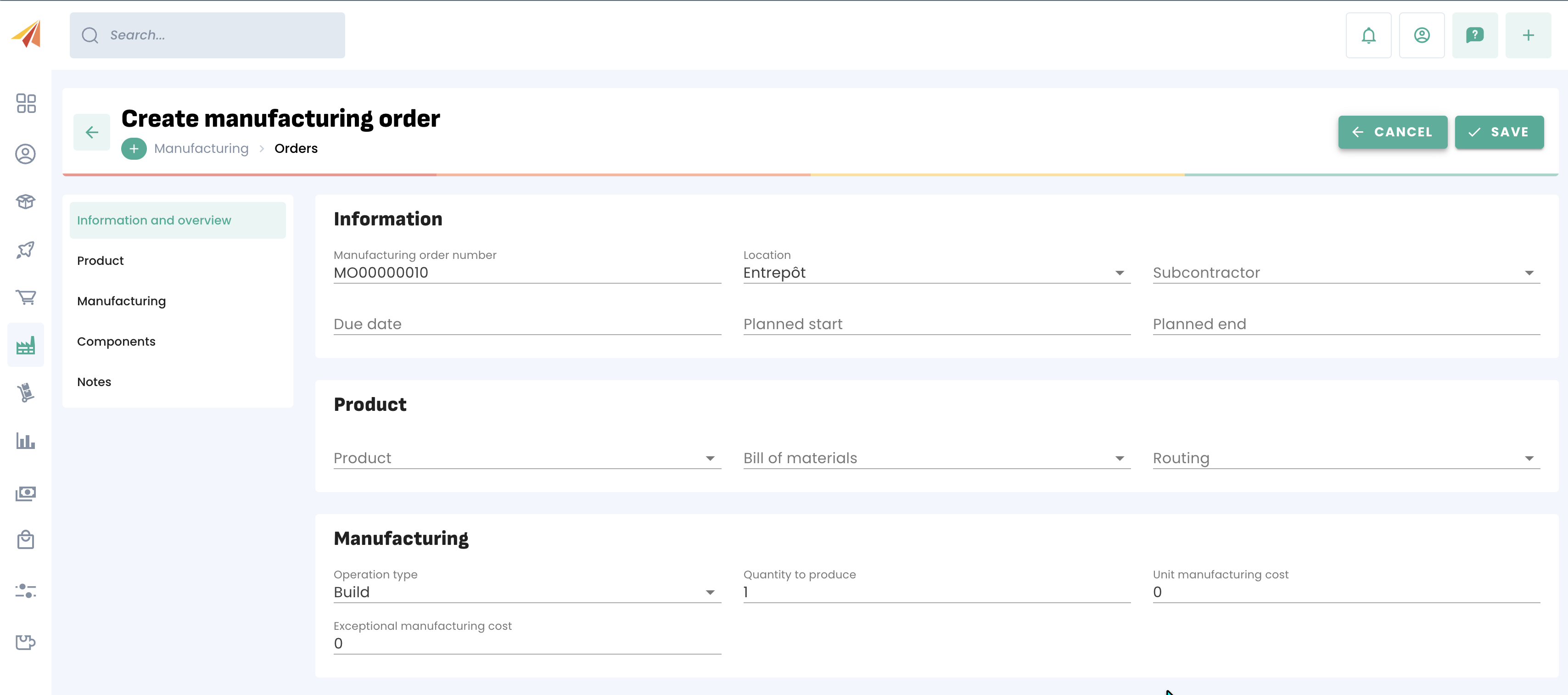 You will then have access to the manufacturing order creation form. This allows you to determine which product will be manufactured, the number of units, the deadlines, the bills of materials and routings used, as well as the identity of the subcontractor if part of the process is outsourced.