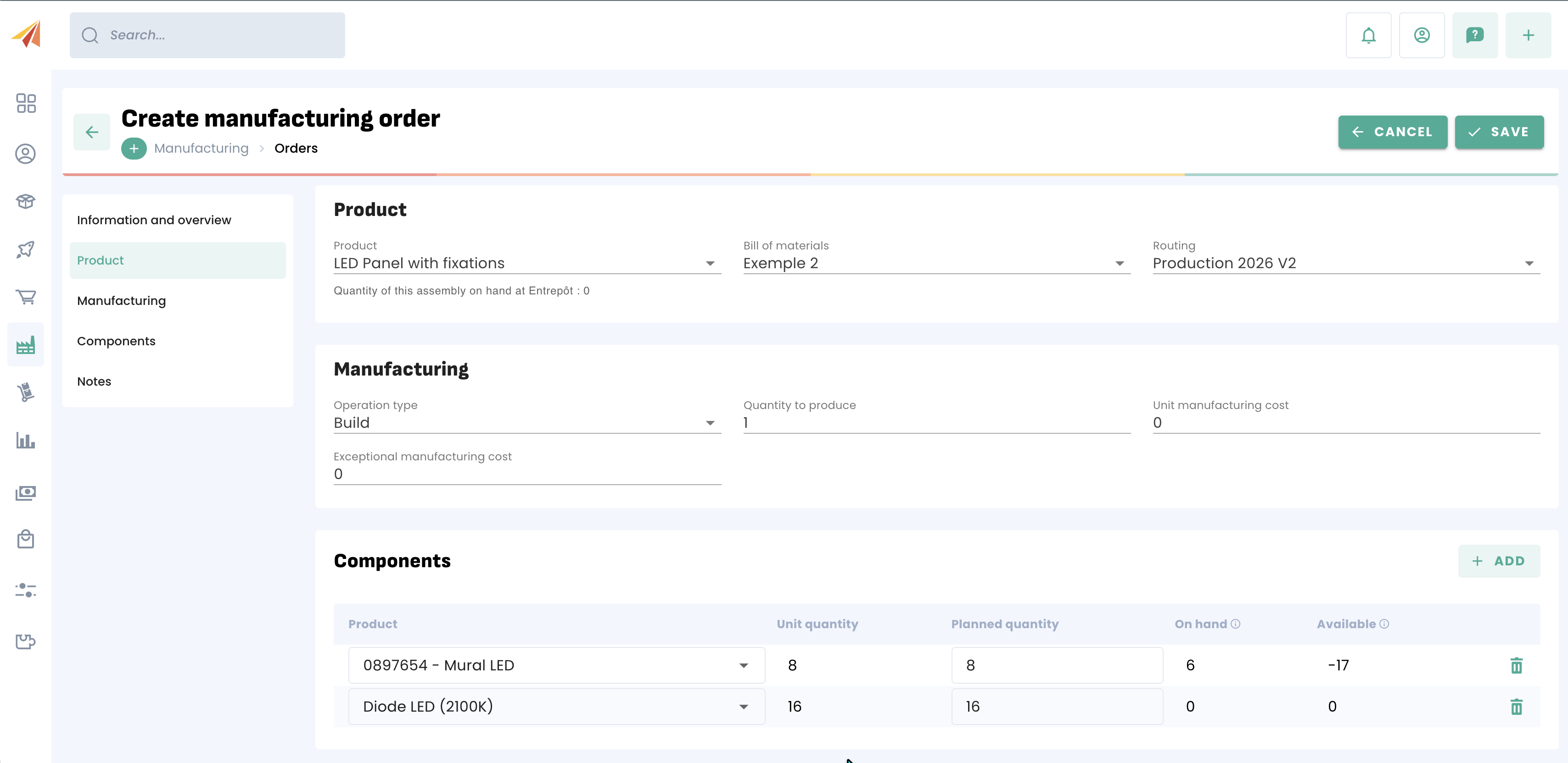 The Components section lists the components specified in the bill of materials; they can be modified if needed. Finally, the notes section allows you to add additional information.