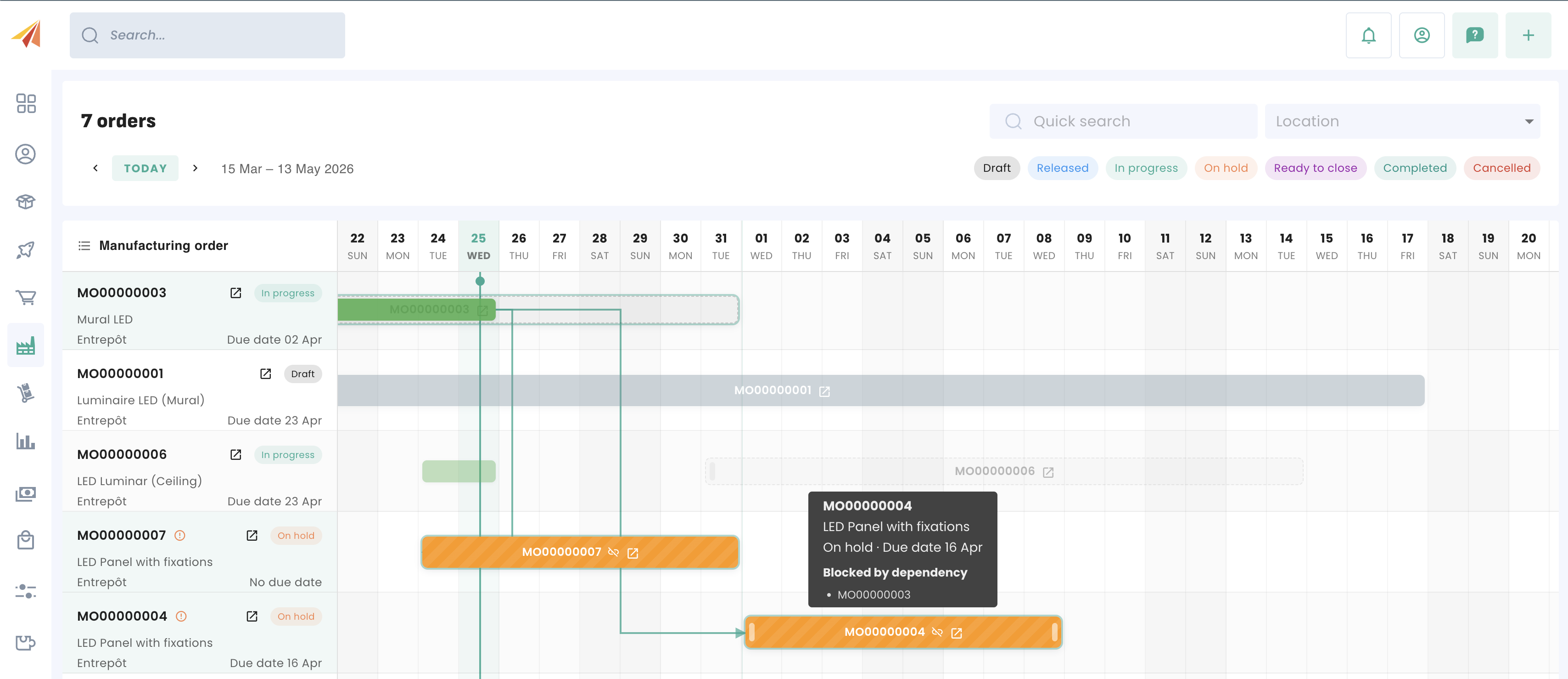 Once the manufacturing order is saved, it is first generated with a Draft status. As soon as the order is created, it is available in the Calendar submenu, which allows you to track manufacturing orders along with their various statuses and deadlines.