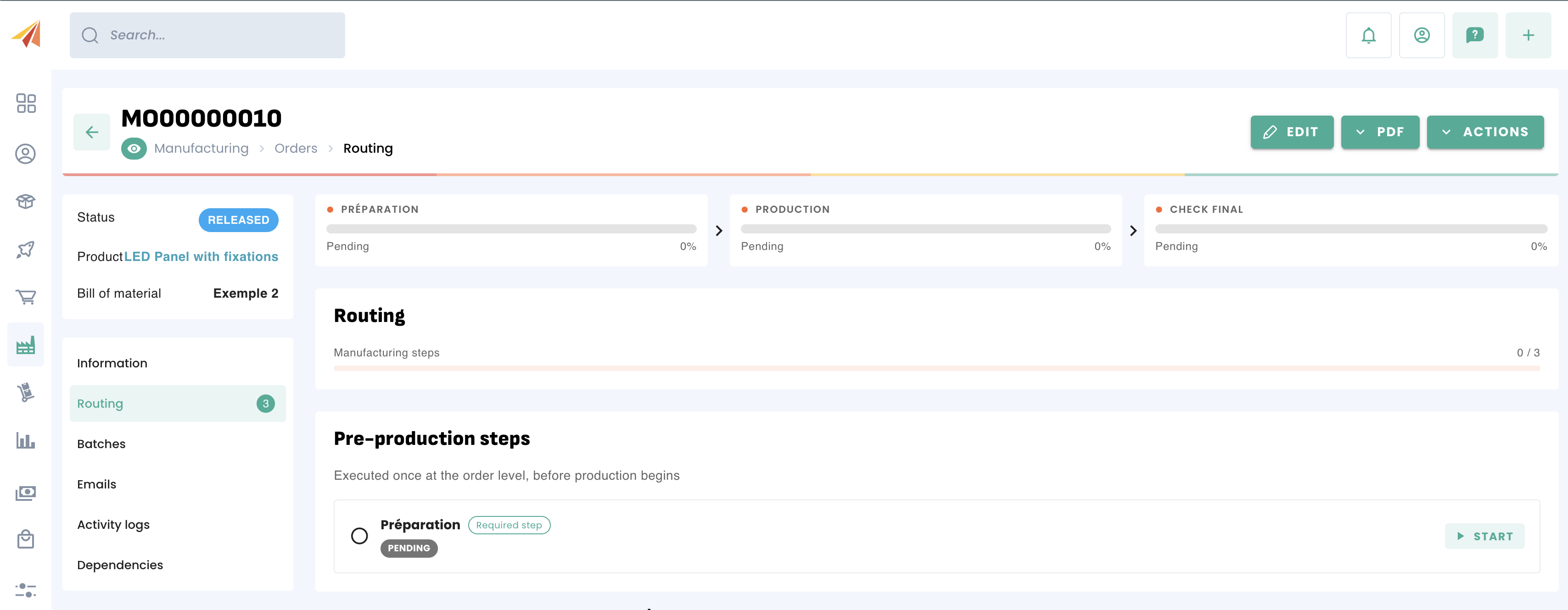 By clicking Finalize, the manufacturing order takes on the status Released, and gives you the option to start the various steps of the Routing. Each step can then be started and completed one by one.