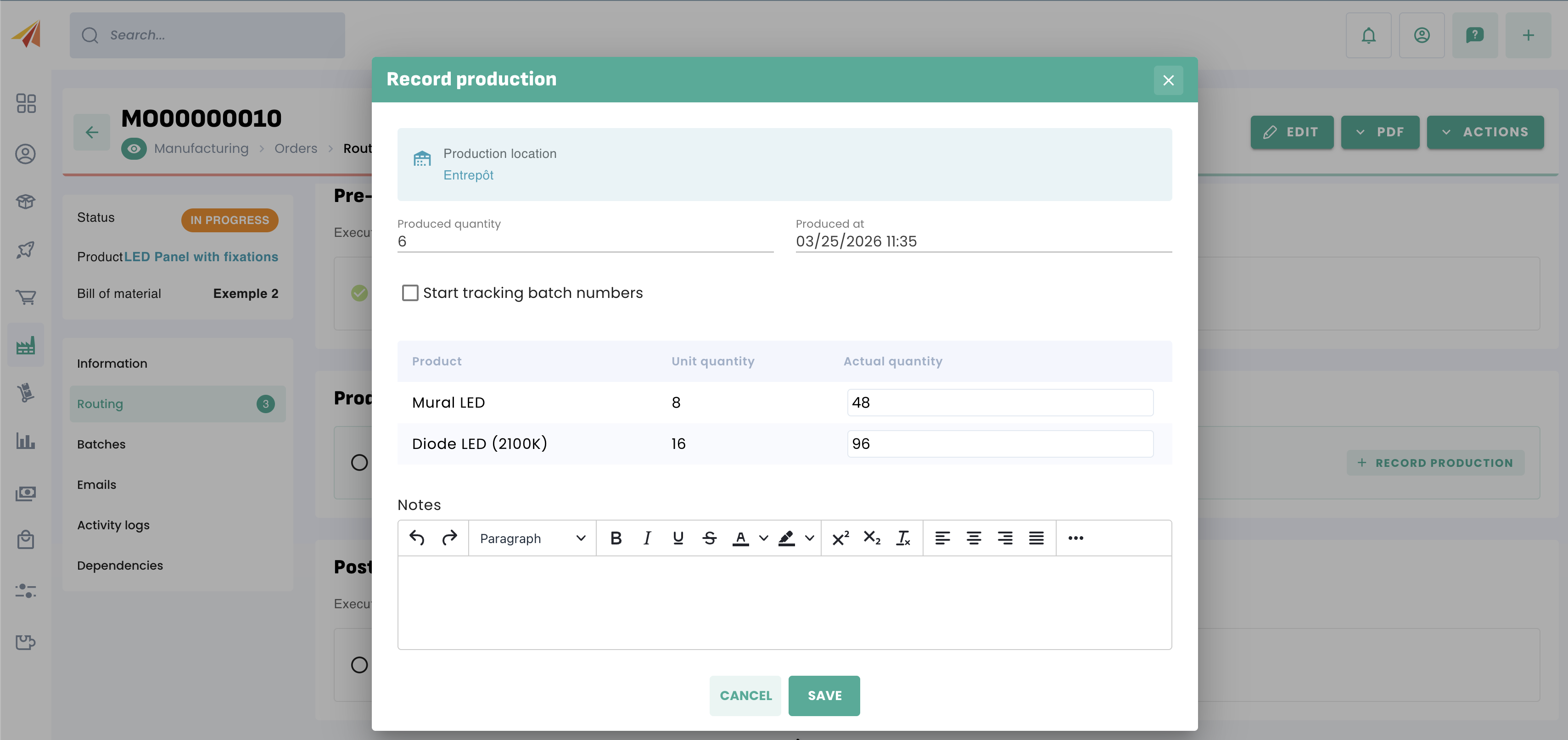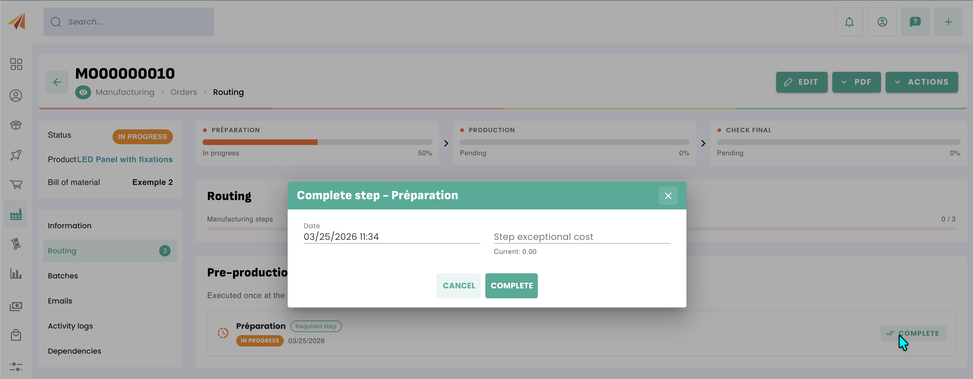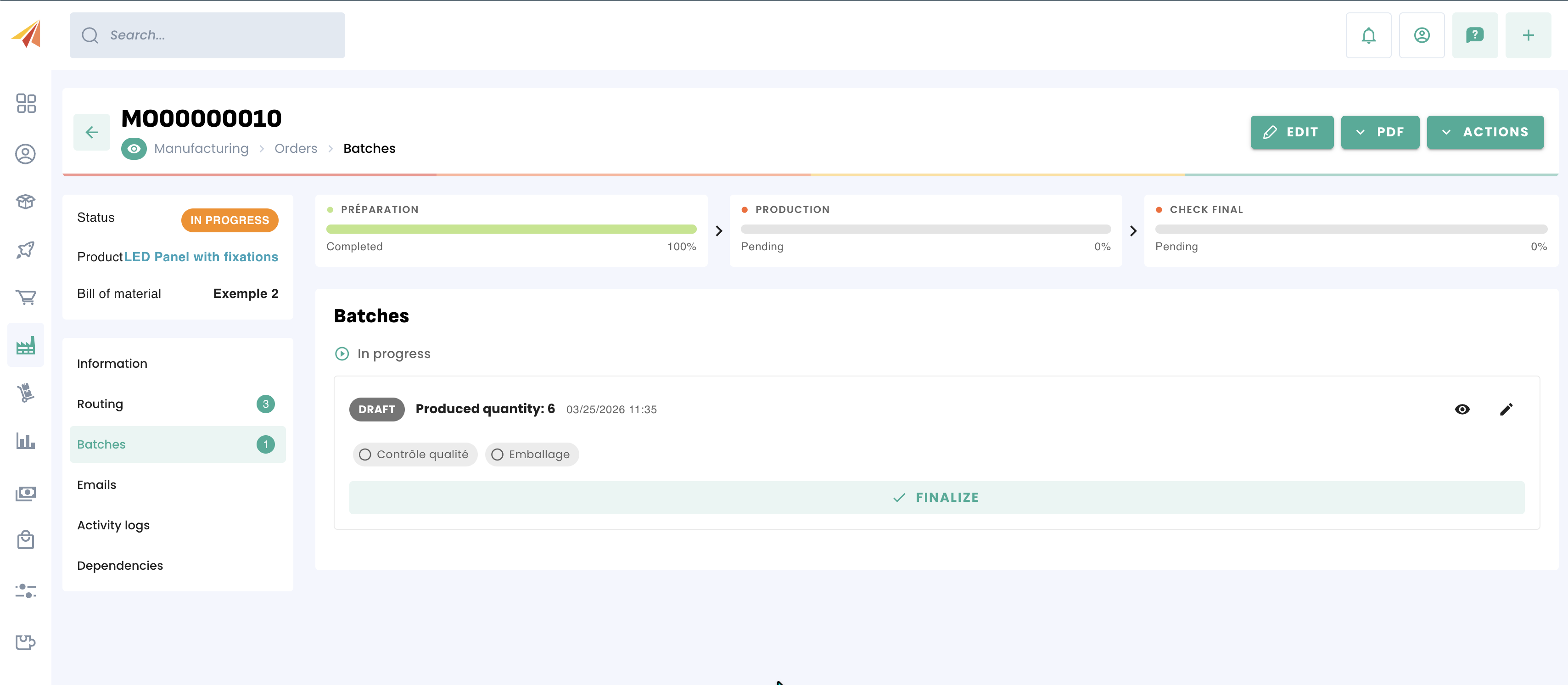 Once a first batch has been created, it can be finalized in the Batches section, by completing the post-production steps defined by the Routing. You can return to the Routing section at any time to record a new production run.