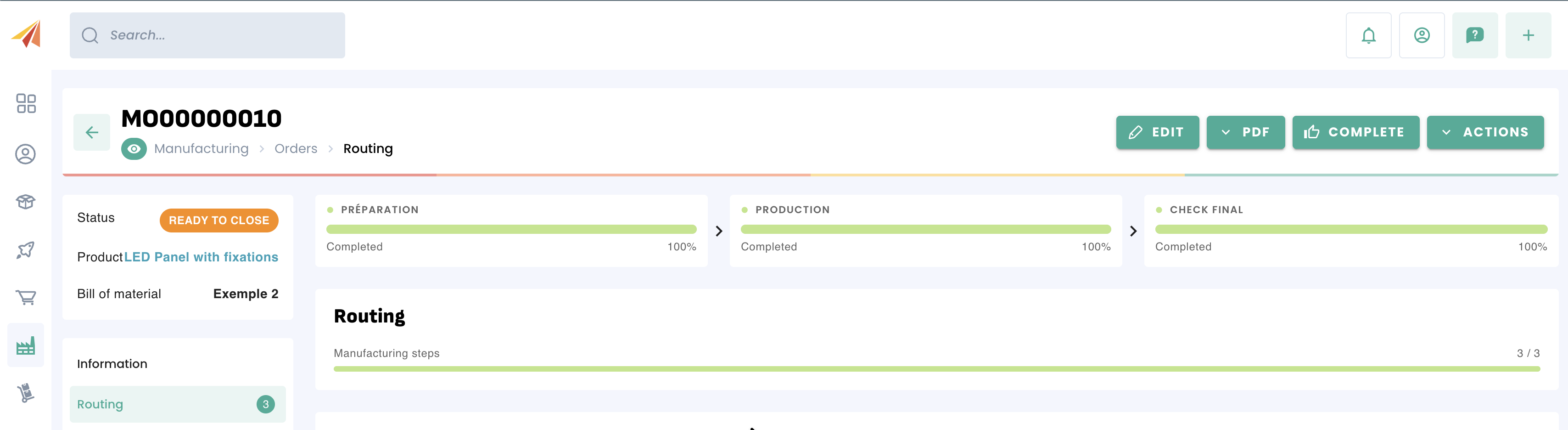 Once all steps are completed, the manufacturing order moves to a Ready to close status. All that remains is to click Complete to close it.