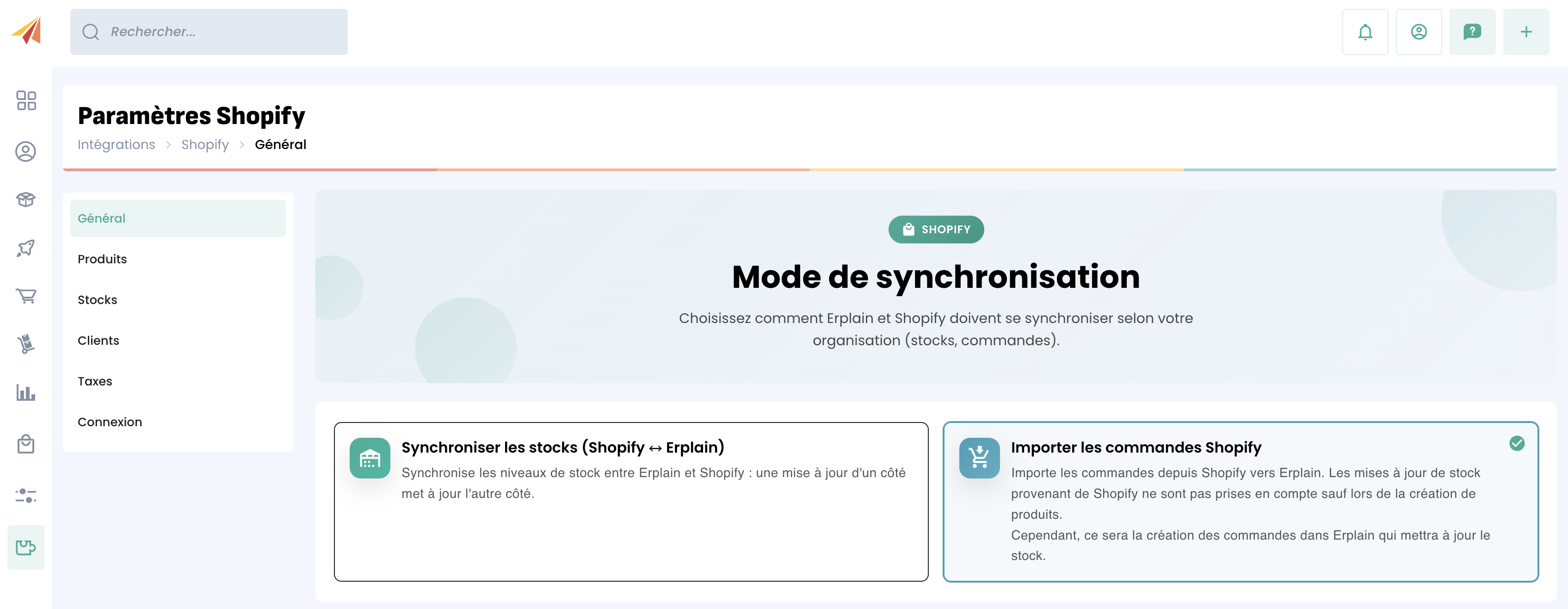 Le premier mode de synchronisation ne synchronise que les stocks, et n'importe donc pas les commandes Shopify dans Erplain. Les stocks sont alors synchronisés dans les 2 sens.