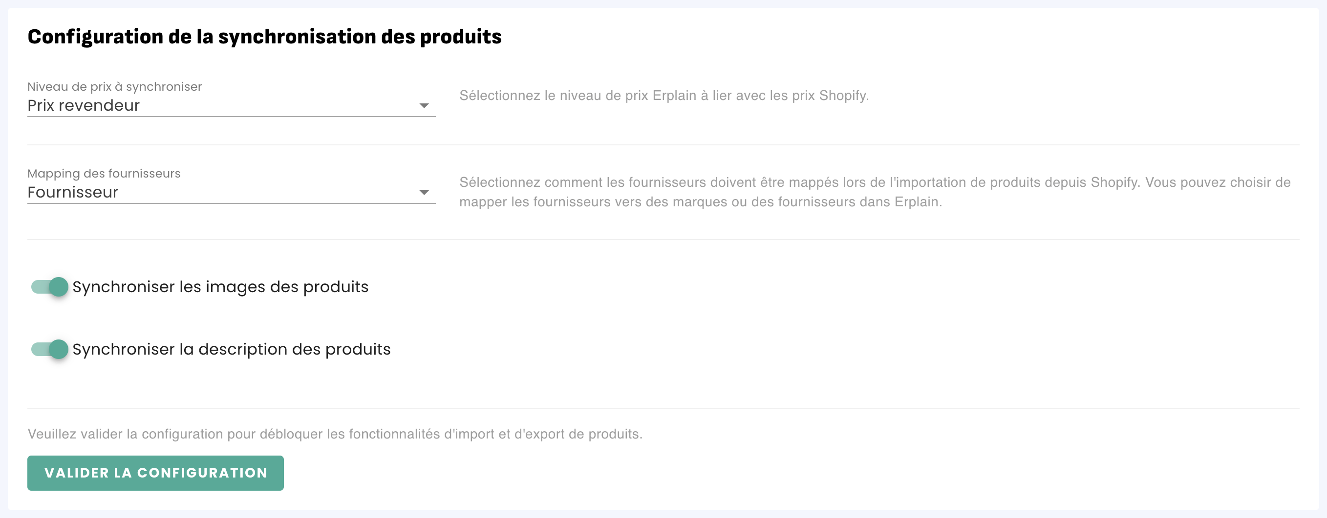 Une première étape de validation est nécessaire avant de pouvoir importer ou exporter des produits. Il faudra choisir quel niveau de prix synchroniser avec Shopify, comment sont mappés les fournisseurs ainsi que de synchroniser ou non les images et descriptions des produits.