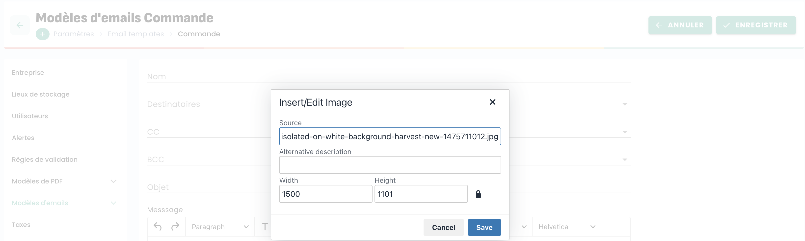 Si vous souhaitez ajouter une image ou une signature à votre modèle d'email, il faudra ajouter le lien de la photo plutôt que télécharger un fichier.