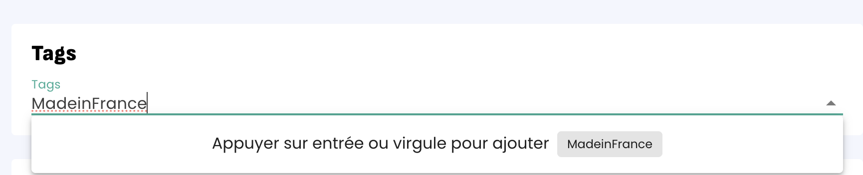 Pour créer un tag, créer ou modifier un produit ou service, allez dans le champ "Tags" et commencez à saisir votre tag. Si le tag n'existe pas, vous pourrez le créer en cliquant simplement dessus une fois que vous avez fini d'écrire :