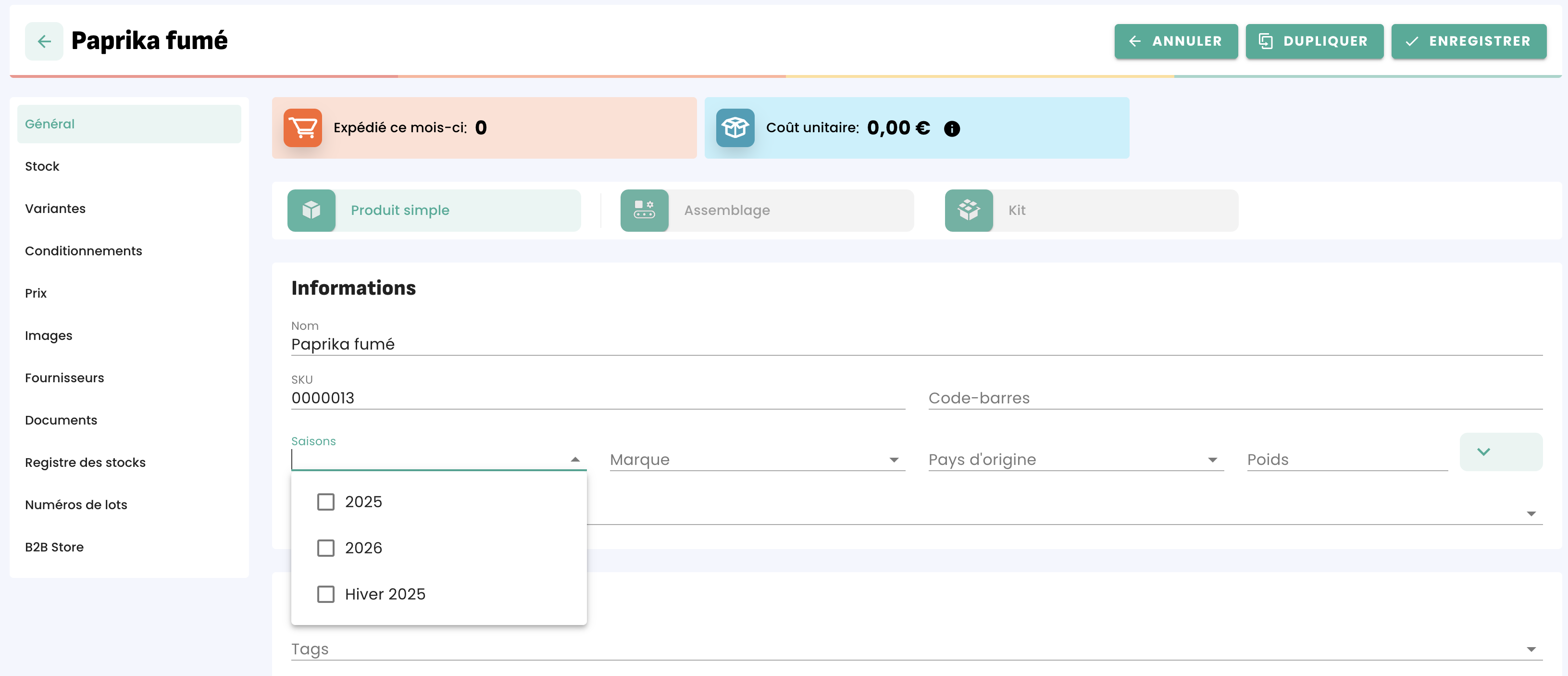 Vous pouvez ajouter et ou créer tags, saisons et marques directement depuis une fiche produit, soit en sélectionnant dans la liste déroulante parmi les options existantes ou en tapant le nom d'une nouvelle option afin de la créer.
