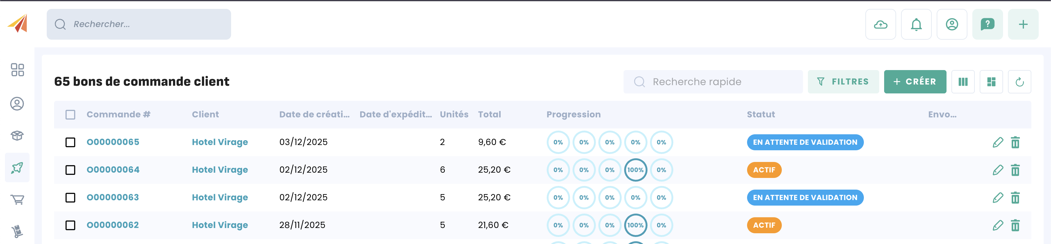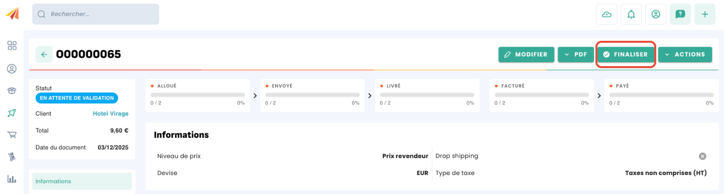 Avant de valider la commande, vous pouvez la modifier ou ajouter des coûts de livraison par exemple. Vous pouvez également la renvoyer au client si nécessaire. Une fois que vous êtes prêt, cliquez sur "Valider" pour valider la commande, son statut passera alors à "Actif" :