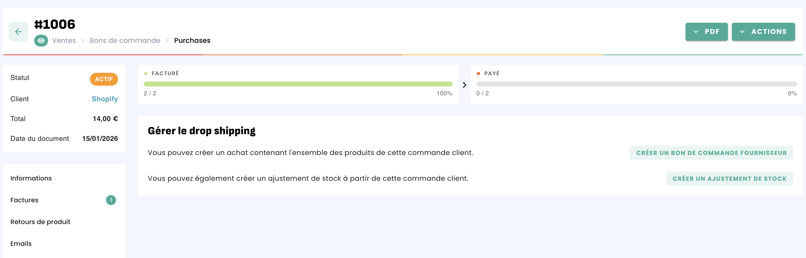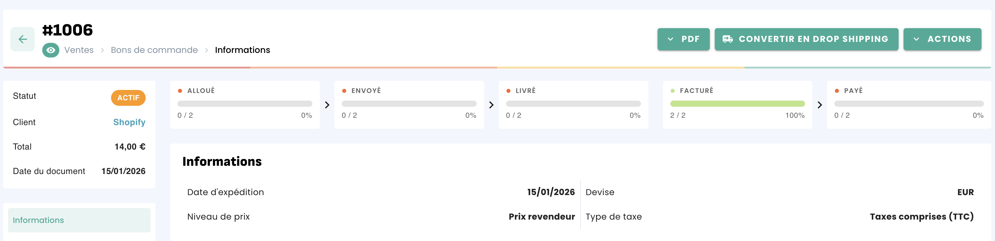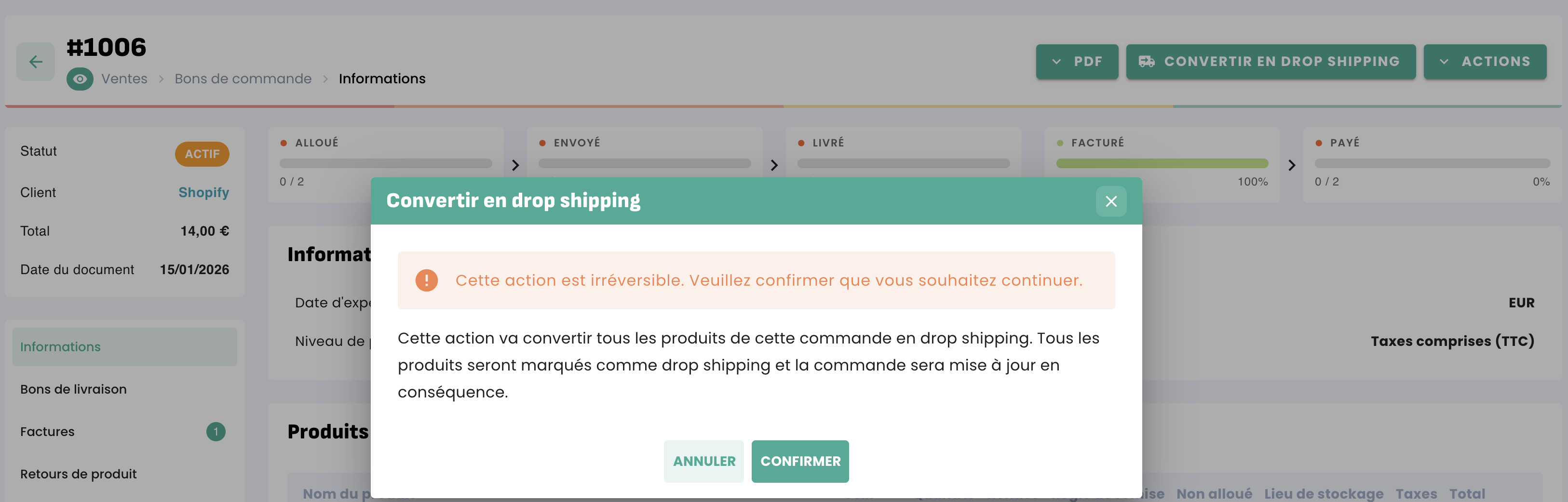 Si vous souhaitez faire une livraison directe pour une commande Shopify, cliquez simplement sur "Convertir en Drop Shipping".