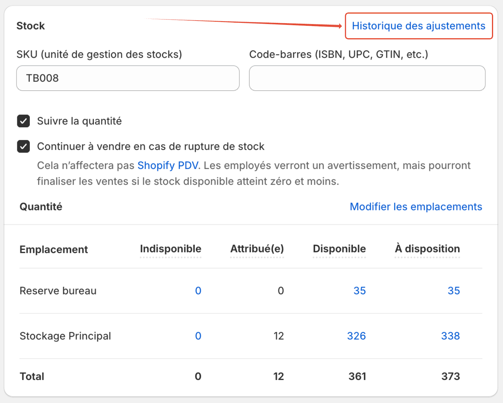 - une capture d'écran de son historique des ajustements de stock de Shopify (qui se trouve sous la fiche produit de Shopify en cliquant sur le lien "Historique des ajustements") :