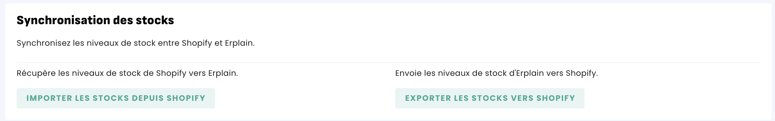 Cet article vous explique la démarche à faire (en deux étapes) si votre stock est différent entre Erplain et Shopify. Des informations supplémentaires ainsi que des détails sur la synchronisation des produits avec Shopify sont disponibles sur cette page.