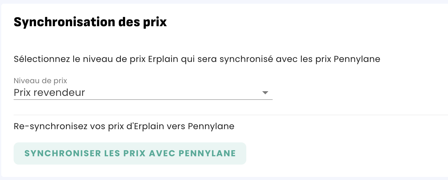 Plusieurs niveaux de prix peuvent être utilisés sur Erplain. Choisissez le niveau de prix que vous souhaitez synchroniser avec Pennylane :