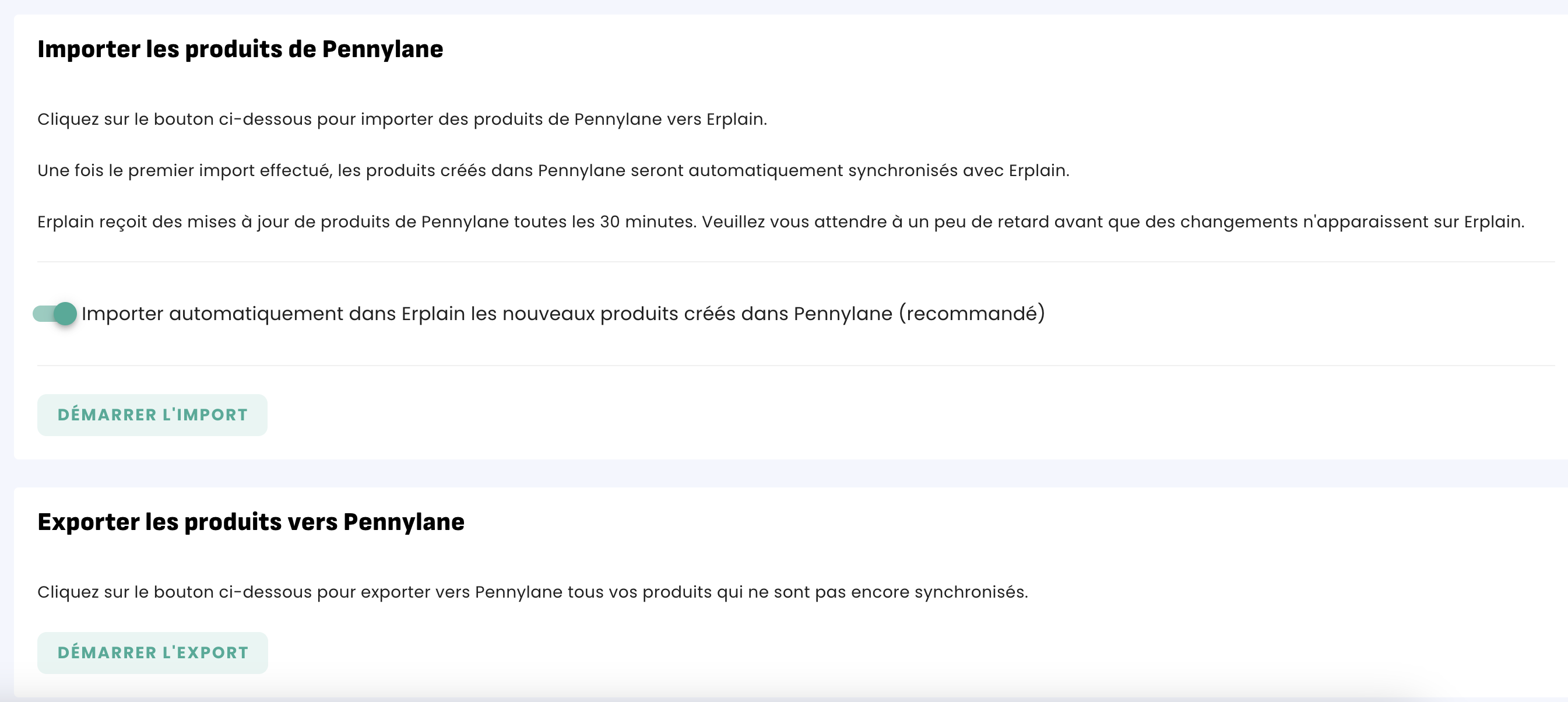 Vous pouvez exporter vos Produits de Erplain vers Pennylane en cliquant sur le bouton "Démarrer l'export".