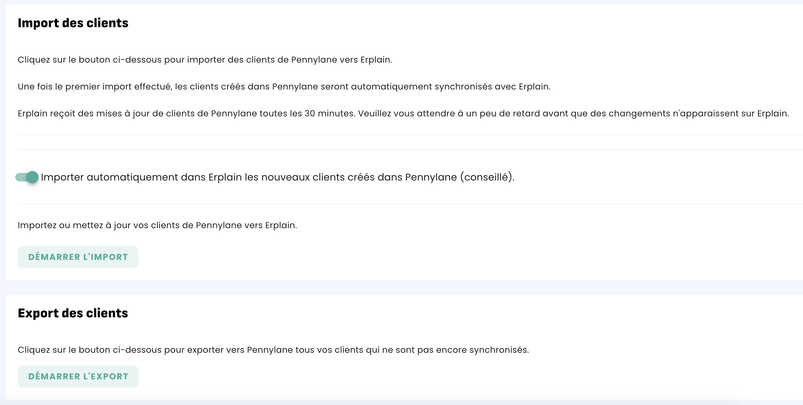 Vous pouvez importer vos clients de Pennylane vers Erplain en cliquant sur le bouton "Démarrer l'import".