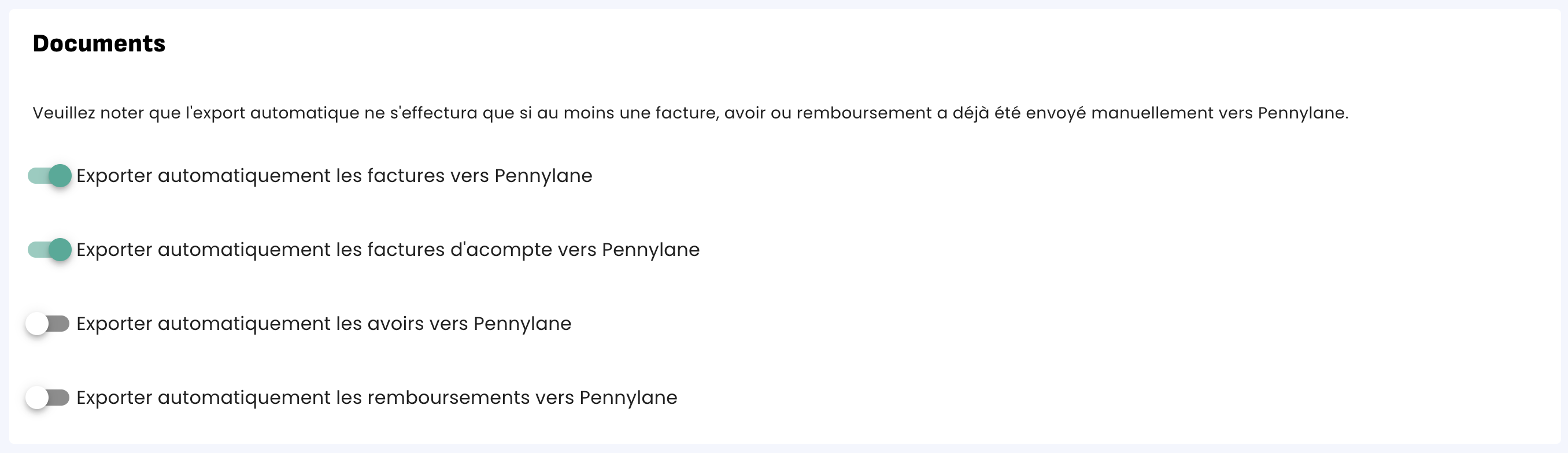 Cette option vous permet de synchroniser vos factures, acomptes, remboursements et avoirs automatiquement de Erplain vers Pennylane. Si vous décochez cette option, vous verrez un bouton "Envoyer vers Pennylane" dans les factures et avoirs.
