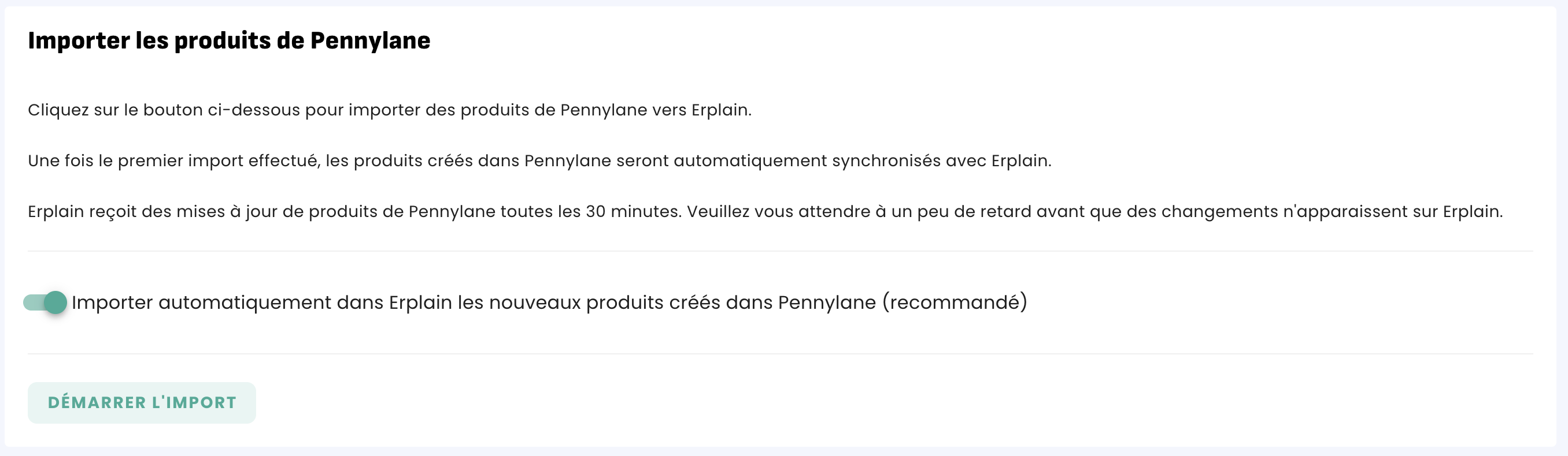 Pour importer vos produits sur Erplain, allez dans le menu "Intégrations" et cliquez sur "Paramètres" dans la section Pennylane, puis cliquez sur "Démarrer l'import" :