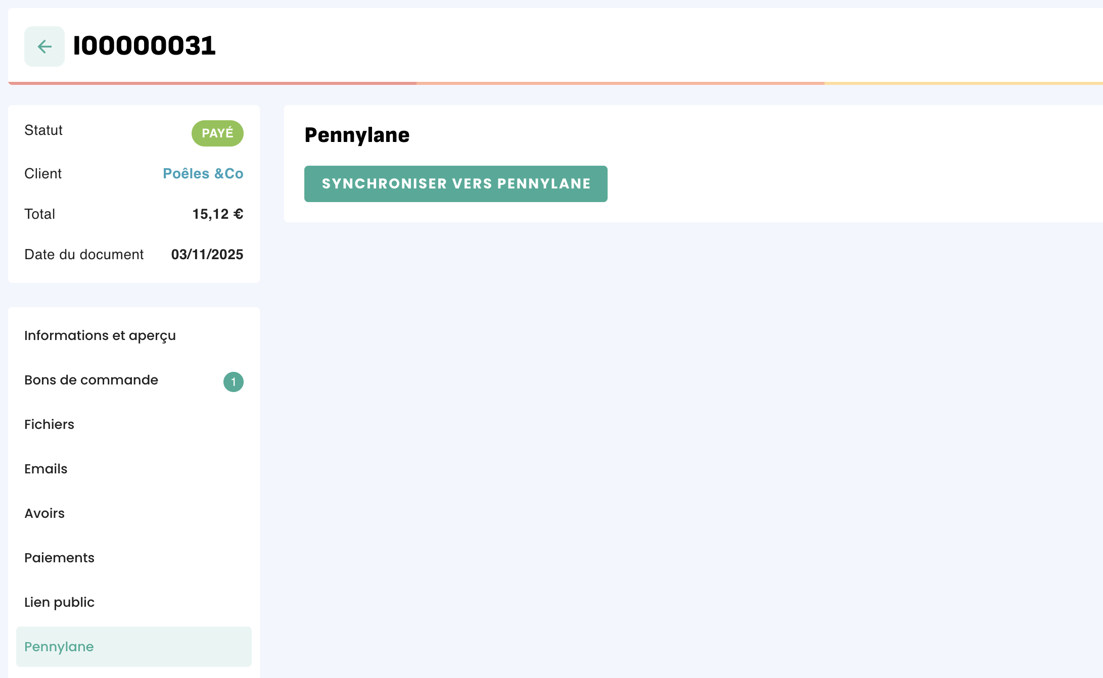 Si cette option n'est pas sélectionnée, vous verrez un bouton "Synchroniser vers Pennylane" dans la facture pour l'envoyer vers Pennylane :